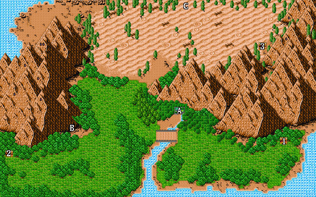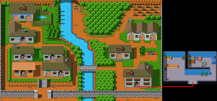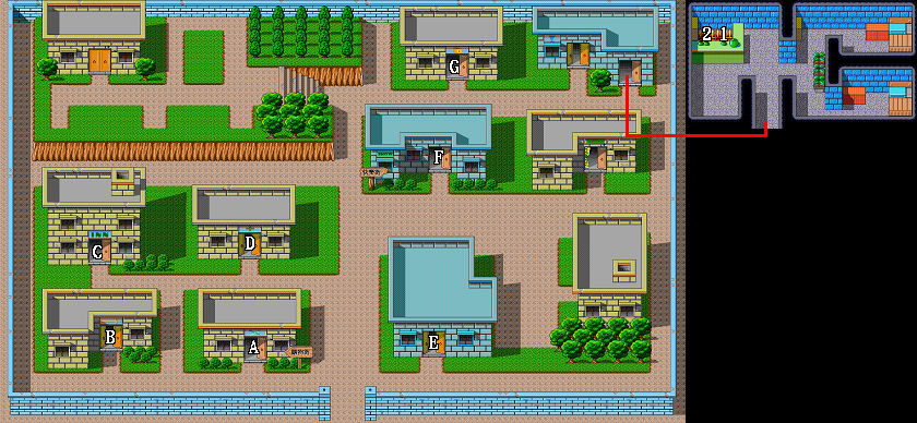 | 1.500金 2.300金 A.防具店 B.武器店 C.旅館(80金/夜) D.道具店 E.蘭的家 F.秀場 G.賭坊 |