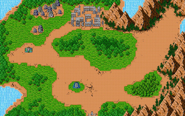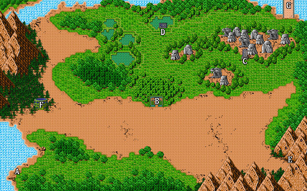 | A.乘船登岸處 B.吉薩城 C.石碑 D.沼澤洞 E.毒蛇洞 F.淫獸塔 G.往迪奧提大陸 |