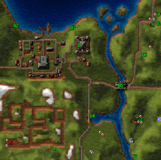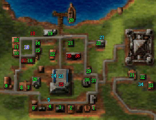 | 21 | 銀行 | 22 | 酒館 | 23 | 泉水:暫時+50力量 | 24 | 泉水:暫時+5個性 | 25 | 市政廳 | 26 | 訓練所(25),最高25級 |