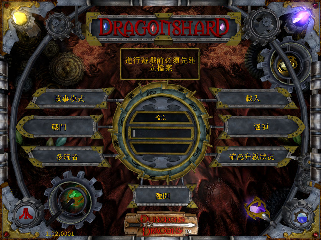 保護:光碟SafeDisc 4.50+序號(8XGU-7A4U-6B6R-M9VS) 備註:安裝時需要第二片,但安裝畫面無法切回桌面,請特別注意。 備註:繁中版安裝完的版本為1.00.0004。 備註:由於繁中版安裝後無法進行更新,同時因為SafeDisc保護關係,無法在Win64系統執行。 建議安裝英文版,然後更升至1.02.0001b,即可免光碟。最後再拷入繁中版下列檔案, 即可變回繁中版(同樣適用於GOG版或Steam版): DND.ini Archives\Fonts.H2O Archives\Fonts_Installer.H2O Archives\Text.H2O Archives\Text_Installer.H2O 檔案:dragonshard_1.2.1b_us_full.rar = 1.02.0001b更新檔(已免光碟) cht.rar = 官方繁化檔(即前述5個檔案)