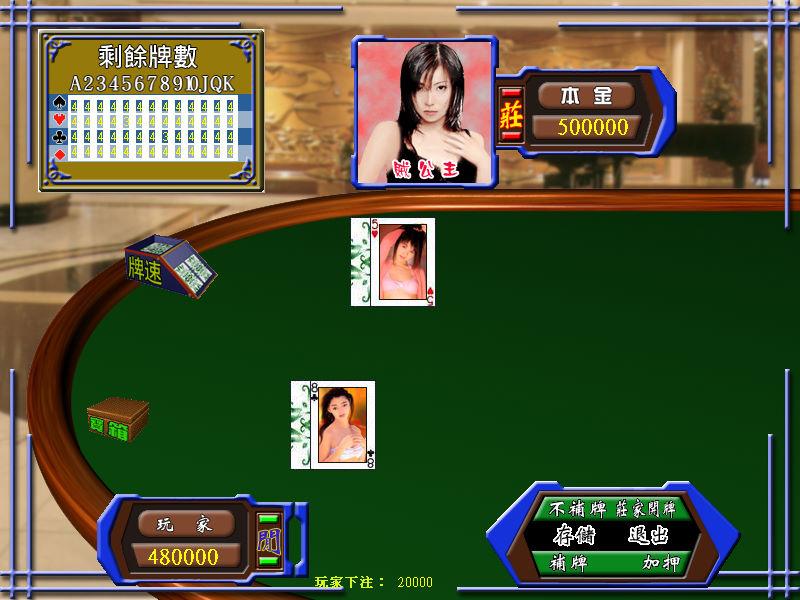 名稱:俏妞對決21點 (中文版) 簡介:伊世紀2002年出品的21點撲克牌遊戲,共有8個女孩可以選擇。不過這只是頭像不同而 已,實際獲勝時,並不會顯示該女孩的美圖。少了這個誘因,單純的21點遊戲其實是 很無聊的。 保護:無 備註:Win64系統可能無法執行,請使用虛擬機+XP系統。