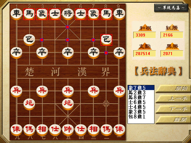5.沙盤推演:和電腦下象棋,但玩家前三手必須下在兵法辭典所列出的著手上。