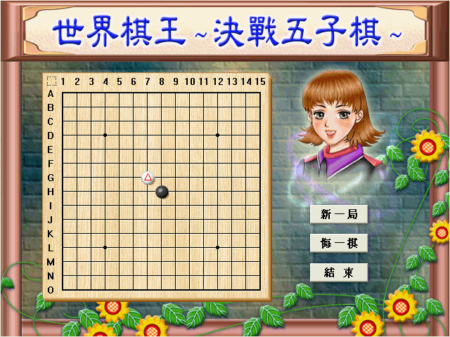 名稱:世界棋王之決戰五子棋 (中文版) 簡介:新造科技2002年出品的五子棋遊戲,收錄在棋王:棋奕對戰經典合輯(上)。遊戲採用 日本規則,只是棋力頗低,也沒什麼功能。特別是滑鼠游標改得很奇怪,讓玩家不易 看清著點位置,造成著棋時的困擾,玩家其實可以考慮改玩其他五子棋遊戲。 保護:無,直接在光碟上執行。 說明:五子棋規則與開局。 備註:本遊戲挑戰五子棋大師2的段位檢定,6級戰四盤皆負。