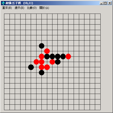 名稱:超級五子棋 (中文版) 簡介:交大資工系機車小子2002年撰寫的五子棋遊戲,採用簡易規則。遊戲的 棋力不差,且會隨著玩家勝負的比數而給出不同的評語,還算有趣。只 是遊戲的功能太少,玩家只能下黑子,且著子沒什麼變化,因此有點棋 力的玩家可能幾盤之後就會開始覺得很膩。 保護:無。 說明:五子棋規則與開局。