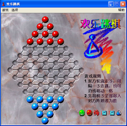 名稱:歡樂跳棋 (簡中版) 簡介:1998年出品的跳棋遊戲,主要為雙人(玩家與電腦)10子的對抗賽。和其他雙人對抗 的跳棋遊戲不同的是,本遊戲的棋盤少掉了四個角,同時距離再縮減兩行,因此棋盤 會比較小,比較容易分出勝負。但也因此無法和其他同類型遊戲進行電腦間的競賽。 保護:無。