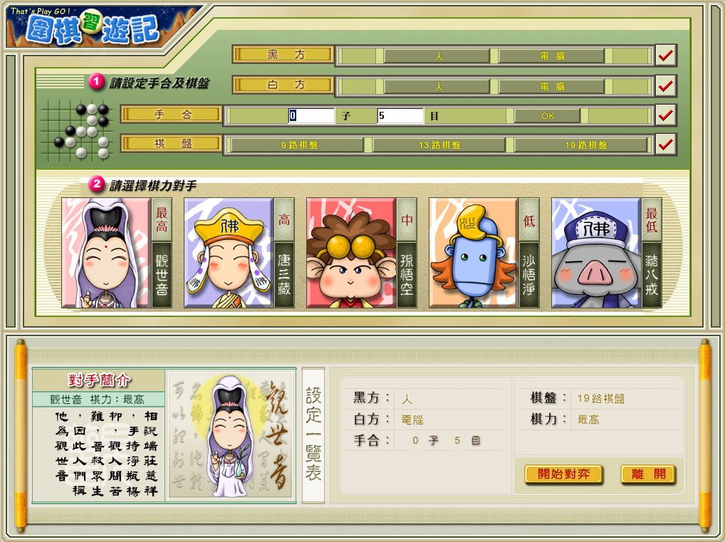 名稱:圍棋西遊記/圍棋習遊記 (中文版) 簡介:晟業資訊2002年出品的圍棋遊戲,主要提供兒童學習圍棋之用,因此遊戲的走向均以 生動有趣為主,以兒童熟悉的西遊記人物做為對手,棋子亦會隨著死活、危險等做出 不同表情,並加上大量的語音來吸引兒童注意。至於圍棋程式主體則略嫌單調,功能 不多。棋力略低,且最高棋力的觀世音思考時間似乎太久了些。對於成人而言,可能 玩初段手談會比較好些。 保護:無,可在光碟裡直接執行。
