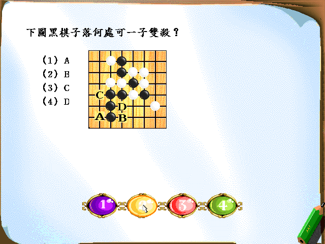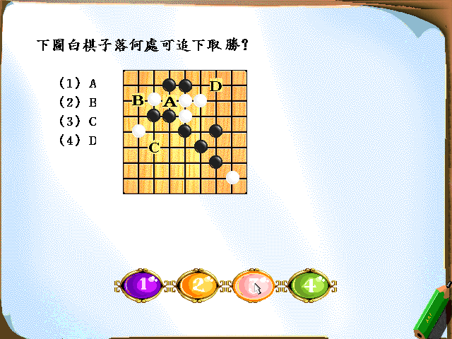 根據比賽規則的不同,標誌一著已完成的規則有[(2)2]種 在對局中,有意放棄自己行棋的機會,應判決[(4)另一方繼續行棋] 利用連續不斷的沖四、嵌五絕對先手,最終連五的行棋手段英文簡稱是[(1)VCF] 追下取勝的涵義是[(2)指利用黑棋禁手取勝的手段] 自由取勝的涵義是[(3)指除追下取勝以外的取勝方法] 棋盤上橫線、豎線的總稱為[(1)陽線] 關於四、三的棋正確的描述為[(4)同時具備一個四,一個活三的棋形] 五子棋的開局一般在[(4)15]步之內 五子棋中局面的概念為[(1)對局中某一段時間內雙方子力的分佈情況] 既合乎邏輯又出人意料,使局面頓時向好的方面改觀的一著棋稱為[(2)妙著] 對局中正確的著法稱為[(3)正著] 對局中,導致嚴重不利後果的一步錯誤著法稱為[(3)劣著] 對局中等待有利時機的一步稱為[(1)等著] 對局中不起任何作用的一步棋稱為[(2)廢著] 關於一子雙殺的描述,不正確的是[(3)一子落下出現雙活三,也是一子雙殺的一種]![]()