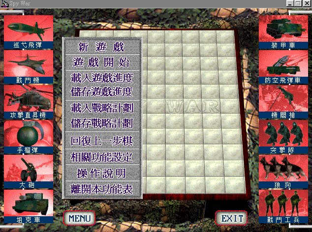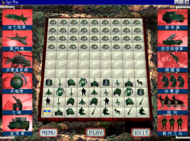 名稱:陸軍元帥 (Spy War,中文版) 簡介:DiD 1998年出品的一種陸軍棋遊戲 [待補]。 保護:光碟 限制:必須在Win9x系統上執行,且顯示模式不可為32位元全彩,否則會出現Overflow錯誤。 說明: 1.各武器由大而小依次為: 巡弋飛彈、戰鬥機、攻擊直昇機、手榴彈、大砲、坦克車、裝甲車、防空飛彈車、機關槍、 突擊隊、狼狗、戰鬥工兵 2.例外情況: 防空飛彈車:勝戰鬥機、攻擊直昇機 戰鬥工兵:勝巡弋飛彈、手榴彈 3.先取得對方軍旗者獲勝