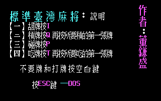 名稱:標準台灣麻將 (中文版) 簡介:董鎌盛撰寫的16張麻將遊戲,出品年代不明。整個遊戲非常陽春,只能算是一個小品 遊戲而已。雖然程式沒什麼問題,但不便的操作、難聽的音效加上難看的畫面,基本 上已經很難吸引現代的玩家來玩了。 保護:無 說明: 1.對手每打一張牌,均必須按Space繼續,或按TPQI進行吃碰槓胡牌,遊戲不會主動提示。