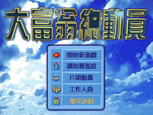 名稱:大富翁總動員1:瘋狂模擬戰 (中文版) 簡介:亞克米科技1997年出品的大富翁遊戲,由第三波代理發行 [待補]。 備註:本版為1997/07/24新版 保護:光碟 備註:本遊戲在DOS上安裝時,會連同Win95安裝程式一併拷入安裝目錄。若要最少化檔案, 可在Windows系統安裝完畢後,再拷回DOS系統中執行。 備註:安裝後需自行執行SETSOUND.BAT設定音效卡。