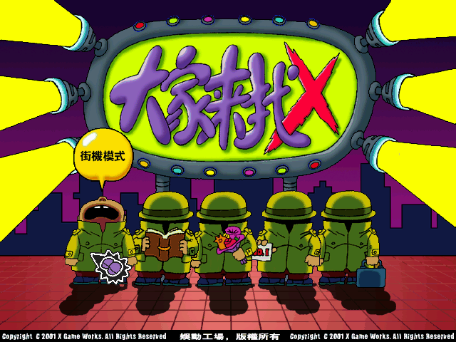 名稱:大家來找X (中文版) 簡介:北京娛動工場2001年出品的圖案找錯益智遊戲,由會宇多媒體代理發行 [待補]。 保護:光碟,破解碼: LookingForX.exe F8 01 75 04 B0 01 -- -- 90 90 -- -- 備註:不能有標題為「大家來找X」的視窗(包括檔案總管),否則遊戲無法啟動。
