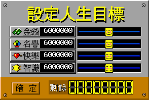 名譽、財富、智識等四種,玩家必須為這四項目標,訂下一個理想中的數值,這些數值便是