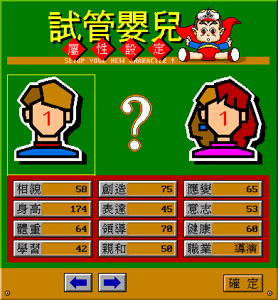 遊戲開始時,玩者必須選擇自己的父母,他們將會影響主角出生時的基本條件,包括相貌、