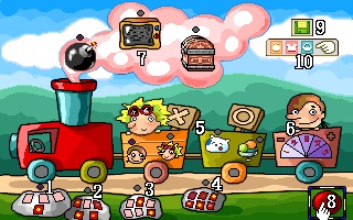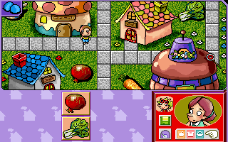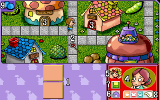 | 1.蓋住的蔬果 2.地圖上可行走的道路 3.買菜的門口(蔬果種類會顯示在房屋旁) 4.媽媽 5.更換買菜主角 6.變更難易度等級 7.系統選單 8.回到主選單 9.再看一次要購買的蔬果(僅限一次) |