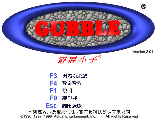 名稱:霹靂小子 (Gubble,中文版) 簡介:Actual Entertainment 1996年出品的動作遊戲,1997年由富爾特中文化並代理發行 [待補]。 備註:本版為2.01版 保護:光碟 密技:在主選單輸入GUBBLEDCHEAT,成功會聽到笑聲,在遊戲中按下: F3 = 移動方塊 F8 = 無敵 F = 過關 + = 速度加快 - = 速度減慢