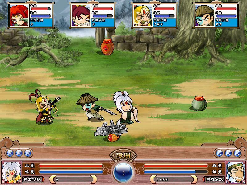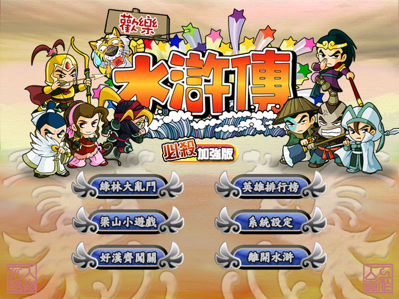 名稱:歡樂水滸傳 (Happy Water Margin,中文版) 簡介:仲環科技2005年出品的動作遊戲,有點類似橫向捲軸打鬥遊戲,但場地範圍有限,且 為六人混戰 [待補]。 備註:本版為必殺加強版 保護:無 備註:執行後播放動畫時若會當機跳出,請移除K-Lite Codec Pack等解碼播放軟體。 說明:左下頭像為我方,其餘為敵方。