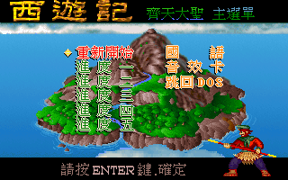 名稱:西遊記:齊天大聖篇 (中文版) 簡介:雷神資訊1995年出品的動作遊戲 [待補]。 保護:光碟 備註:音效卡儘量保持Auto,否則很容易當機。DosBox必須設定sbtype為sb1才有音效。 備註:電腦速度不可過快,否則很容易就死了。 操作: 右Shift = 攻擊(按著可連續攻擊) Space/Enter = 系統選單 Esc = 取消