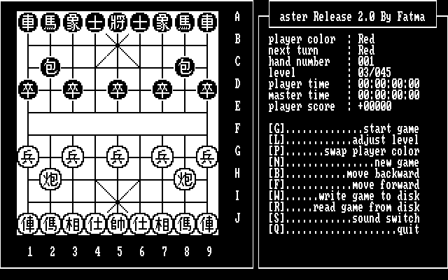 名稱:象棋大師 (Chinese Chess Master,英文版) 簡介:第三波1987年出品的象棋遊戲,作者Fatman。程式小巧,功能不多,棋 力也不高,但在早期而言,已算是一個不錯的象棋遊戲了。 備註:本版為2.0版。 保護:不明 備註:將本遊戲的棋力Level設定為6/45(等級太高思考時間會太久),與將族 下,約與最差的笨豬相當,因此棋力算是頗差。
