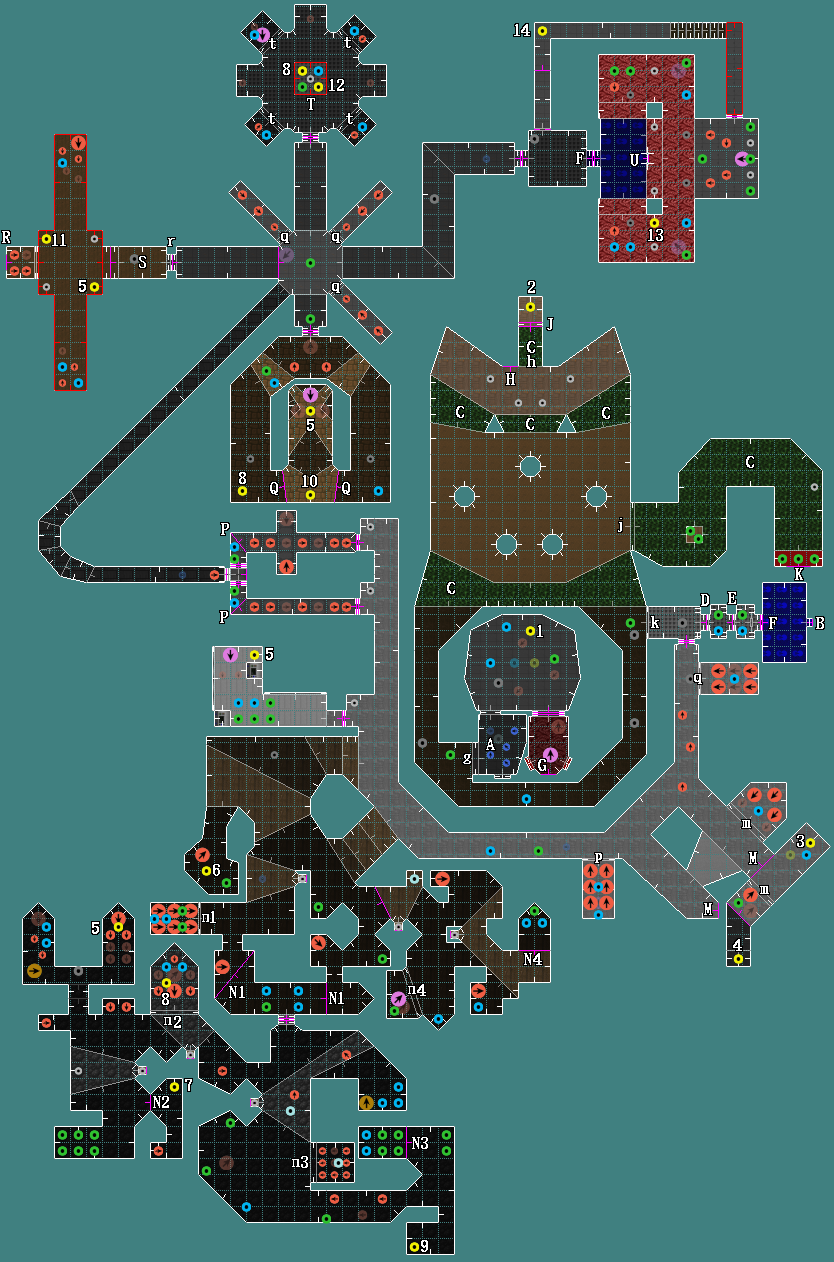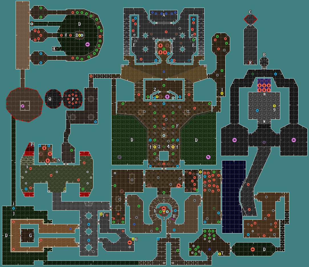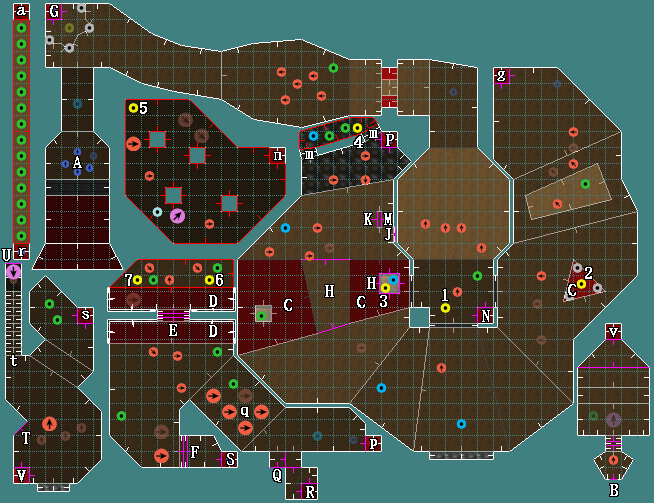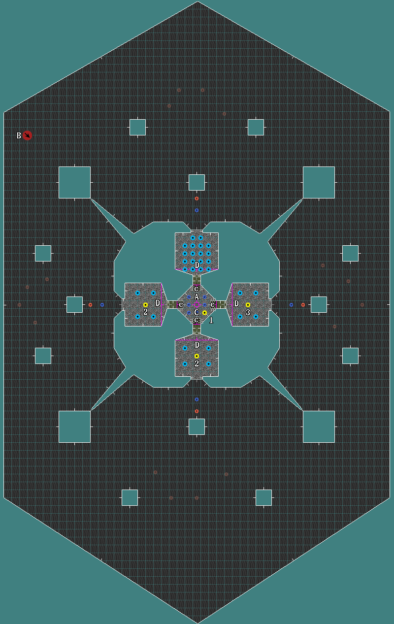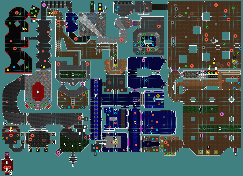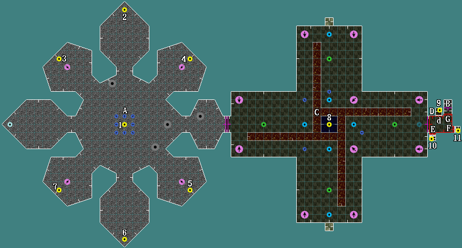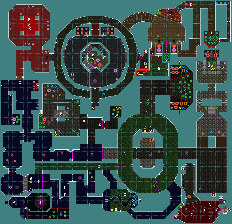 | A.初始位置 B.出口傳送點 C.超級幅射區域,每秒20傷 D.開啟門d的按鈕 E.需藍鑰匙開啟的門 F.需紅鑰匙開啟的門 G.需黃鑰匙開啟的門 1.藍護甲 2.電漿槍 3.機槍 4.火箭炮 5.霰彈槍 6.電鋸 7.地圖 8.靈魂球 9.藍鑰匙 10.紅鑰匙 11.黃鑰匙 |