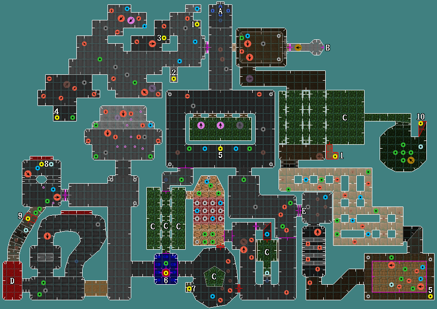 | A.初始位置 B.出口按鈕 C.幅射區域,每秒5傷 D.幅射區域,每秒10傷 E.需藍鑰匙開啟的門 1.幅射防護衣 2.綠護甲 3.狂暴 4.機槍 5.隱形 6.霰彈槍 7.藍護甲 8.藍鑰匙 9.電漿槍 10.靈魂球 |