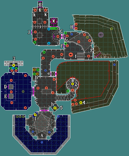 | A.初始位置 B.出口按鈕 C.需藍鑰匙開啟的門 D.開啟牆d的按鈕 E.開啟牆e的按鈕 F.開啟樓梯f的按鈕 G.走過會暫時開啟牆g H.開啟牆h的按鈕 J.開啟牆j的按鈕 K.走過會降下平台k M.傳送至m 1.狂暴 2.綠護甲 3.藍護甲 4.霰彈槍 5.藍鑰匙 |