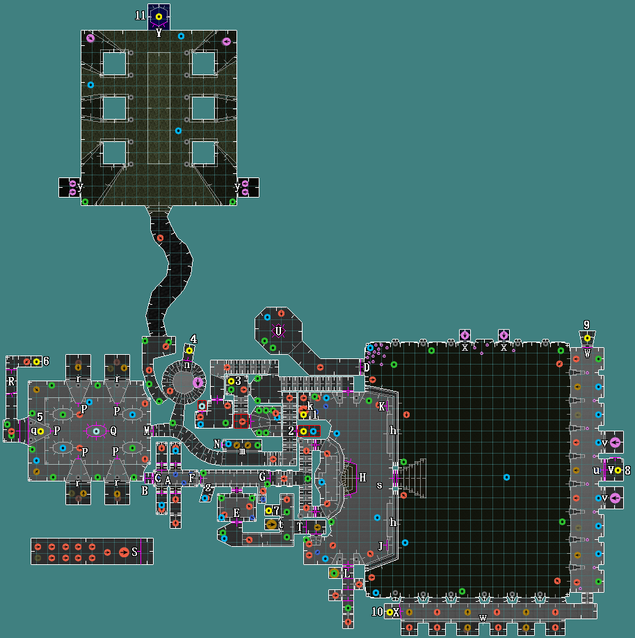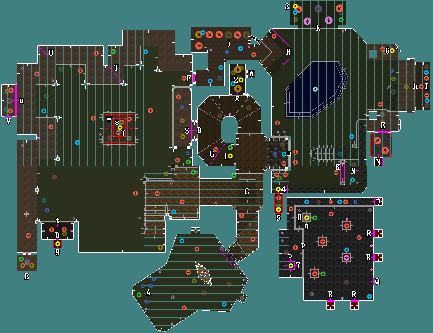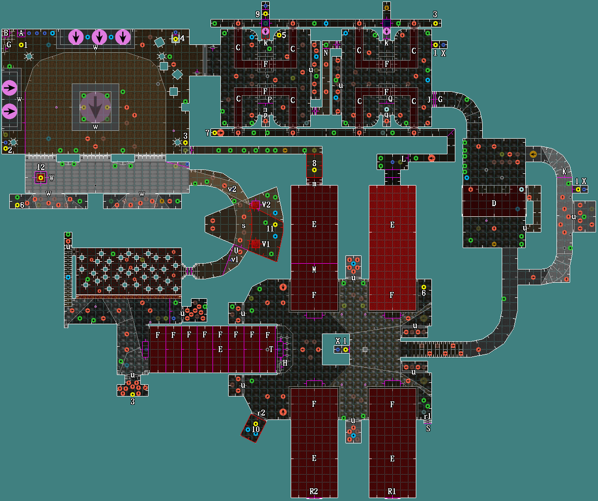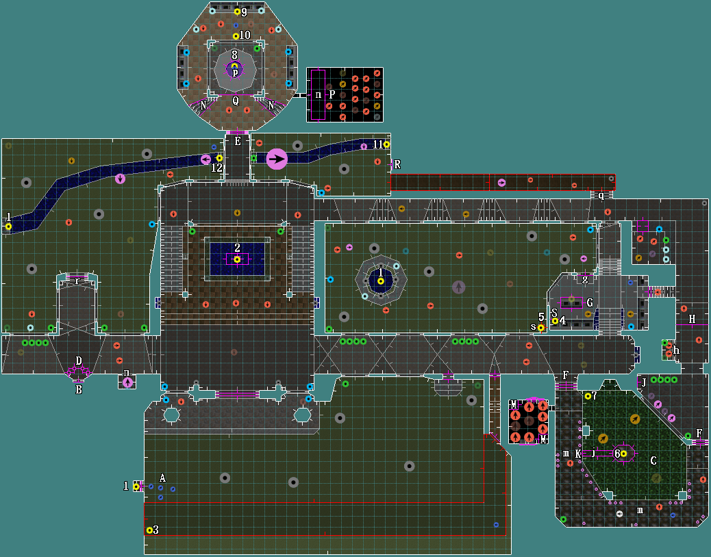 | A.初始位置 B.出口按鈕 C.需紅鑰匙開啟的門 D.需藍鑰匙開啟的門 E.需黃鑰匙開啟的門 F.暫時降下平台f的按鈕 G.暫時降下平台g的按鈕 H.幻象牆 J.暫時開啟牆j的按鈕 K.傳送至k L.走過會開啟兩旁的牆 M.暫時開啟牆m的按鈕 N.走過會開啟牆n P.走過會開啟牆p Q.怪物傳送至q R.傳送至r | 1.霰彈槍 2.靈魂球 3.綠護甲 4.雙管霰彈槍 5.黃鑰匙 6.超級球 7.藍鑰匙 8.紅鑰匙 9.火箭炮 |