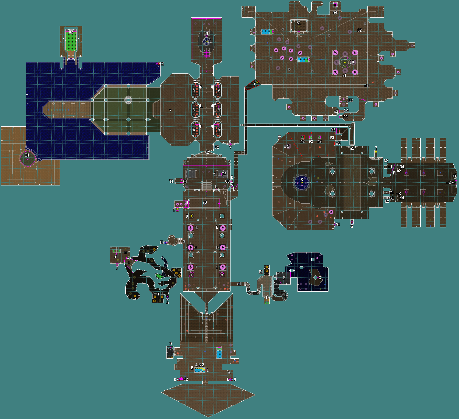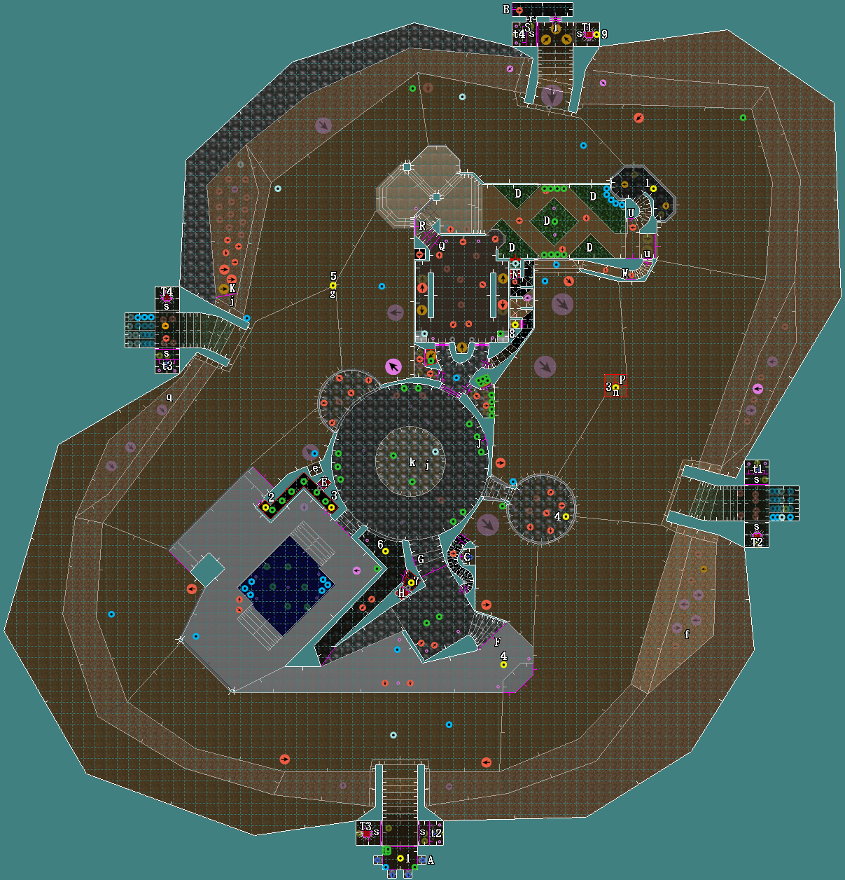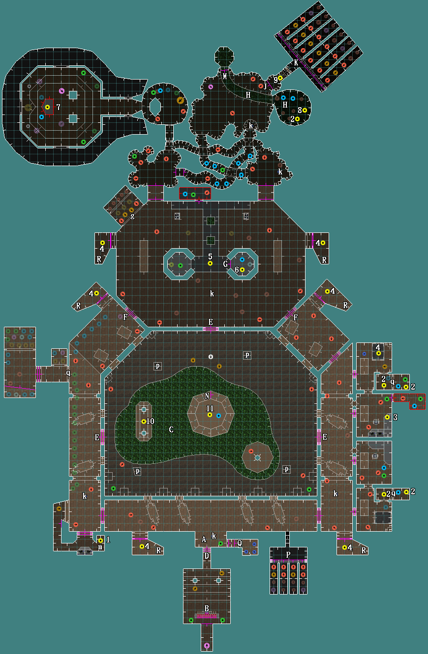 | A.初始位置 B.出口按鈕 C.需紅鑰匙開啟的門 D.需藍鑰匙開啟的門 E.需黃鑰匙開啟的門 F.暫時降下平台f的按鈕 G.暫時降下平台g的按鈕 H.幻象牆 J.暫時開啟牆j的按鈕 K.傳送至k L.走過會開啟兩旁的牆 M.暫時開啟牆m的按鈕 N.走過會開啟牆n P.走過會開啟牆p Q.怪物傳送至q R.傳送至r | 1.霰彈槍 2.靈魂球 3.綠護甲 4.雙管霰彈槍 5.黃鑰匙 6.超級球 7.藍鑰匙 8.紅鑰匙 9.火箭炮 |