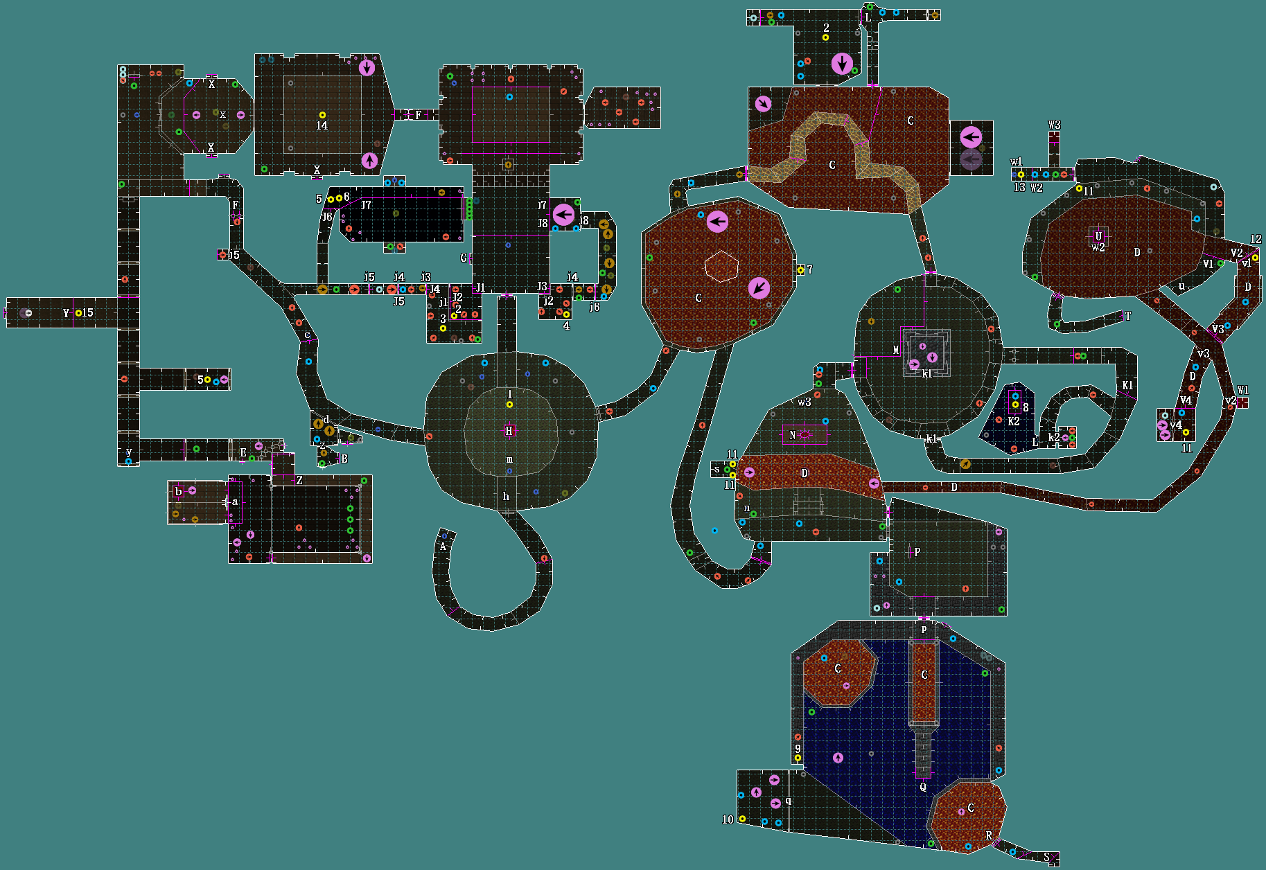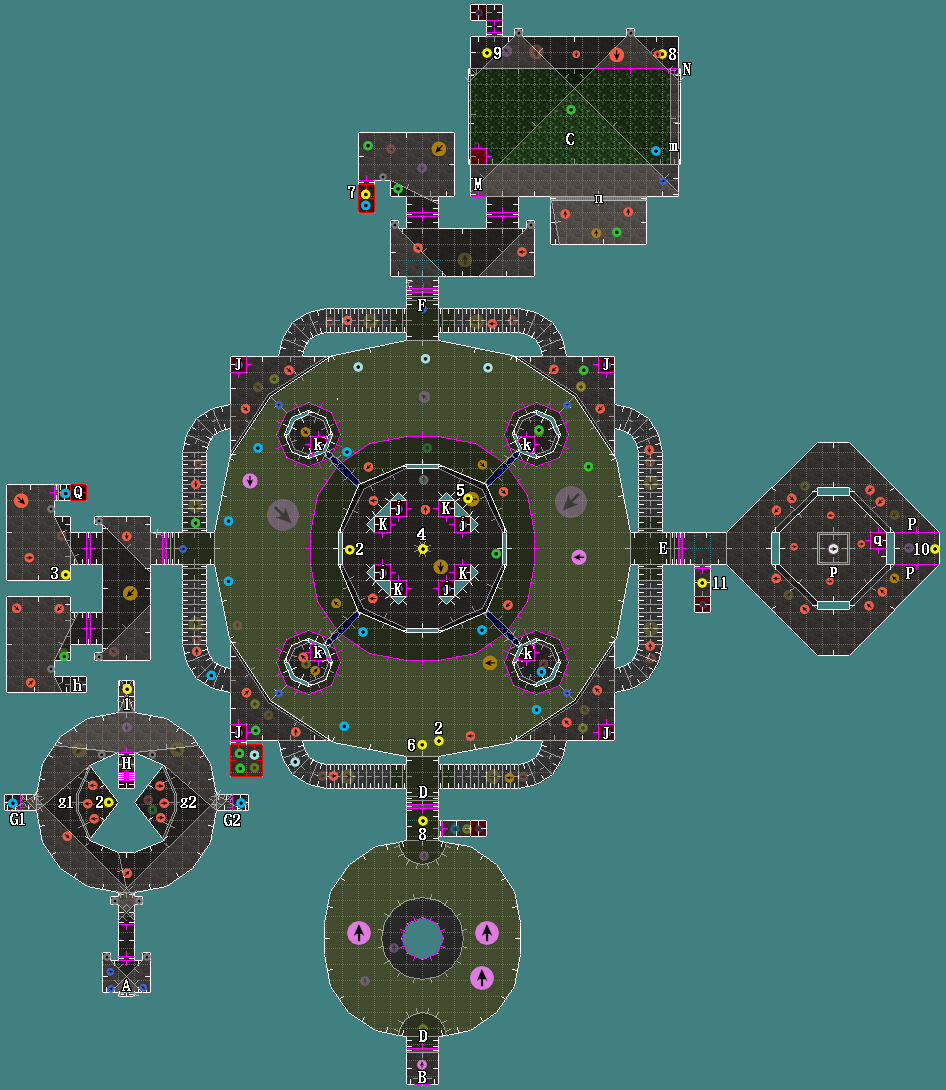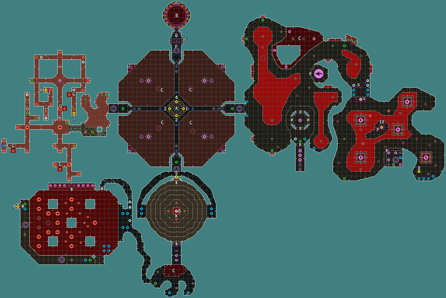 | A.由第一區傳來 B.出口按鈕 C.傳回第一區c D.幅射區域,每秒10傷 E.武器攻擊可開啟牆e F.武器攻擊可升起平台D G.走過會開啟牆g H.傳送至h J.傳送至j K.走過會開啟牆k M.怪物傳送至m N.怪物傳送至n P.怪物傳送至p或m Q.怪物傳送至h R.怪物傳送至r 1.藍護甲 2.電漿槍 3.隱形 4.無敵 5.靈魂球 |