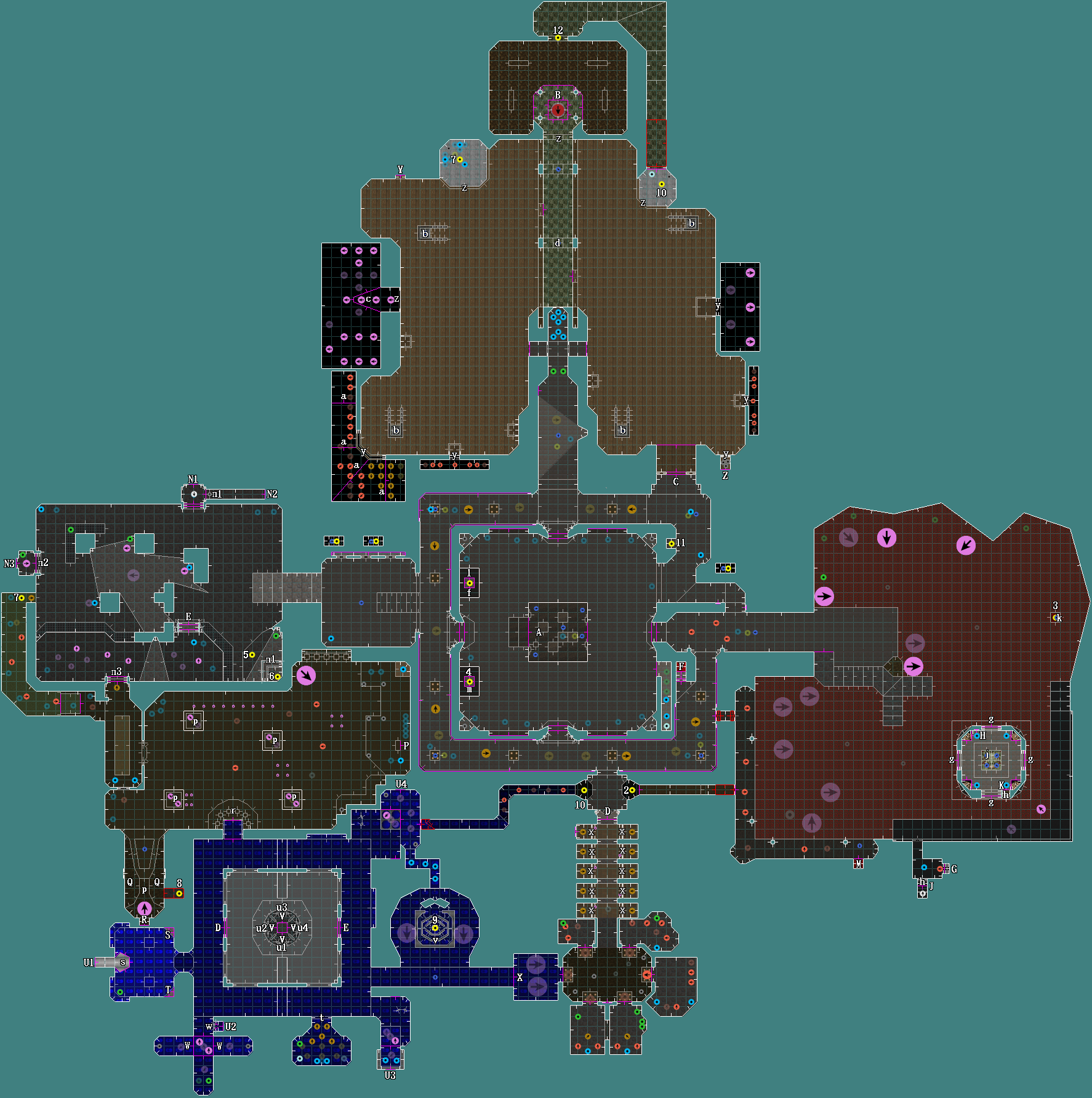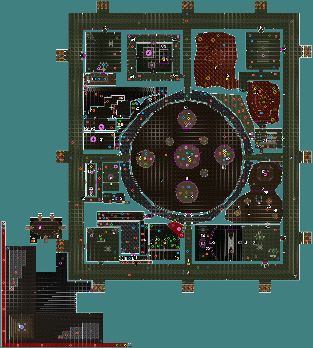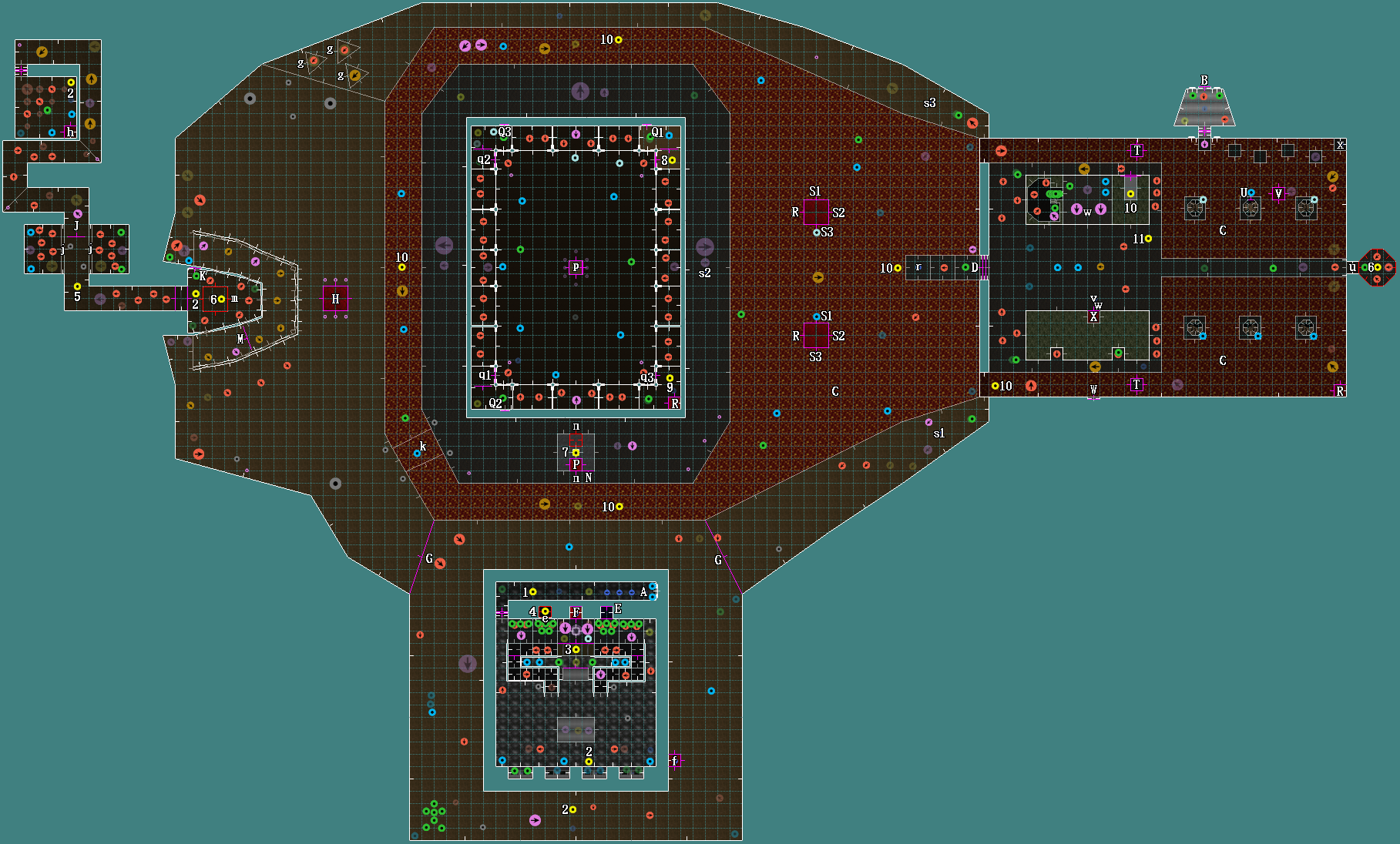 | A.由第一區傳來 B.出口按鈕 C.傳回第一區c D.幅射區域,每秒10傷 E.武器攻擊可開啟牆e F.武器攻擊可升起平台D G.走過會開啟牆g H.傳送至h J.傳送至j K.走過會開啟牆k M.怪物傳送至m N.怪物傳送至n P.怪物傳送至p或m Q.怪物傳送至h R.怪物傳送至r 1.藍護甲 2.電漿槍 3.隱形 4.無敵 5.靈魂球 |