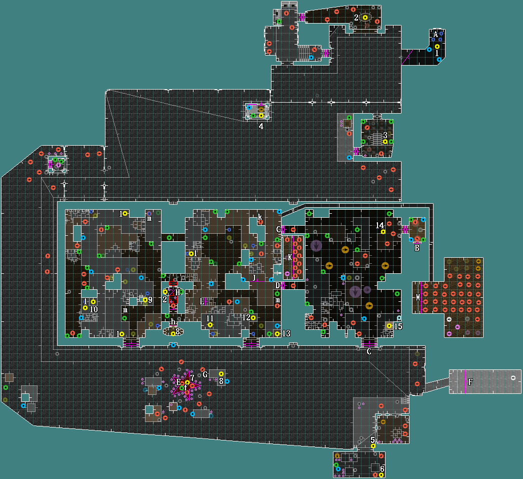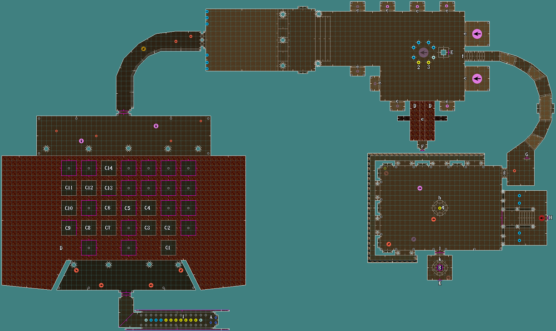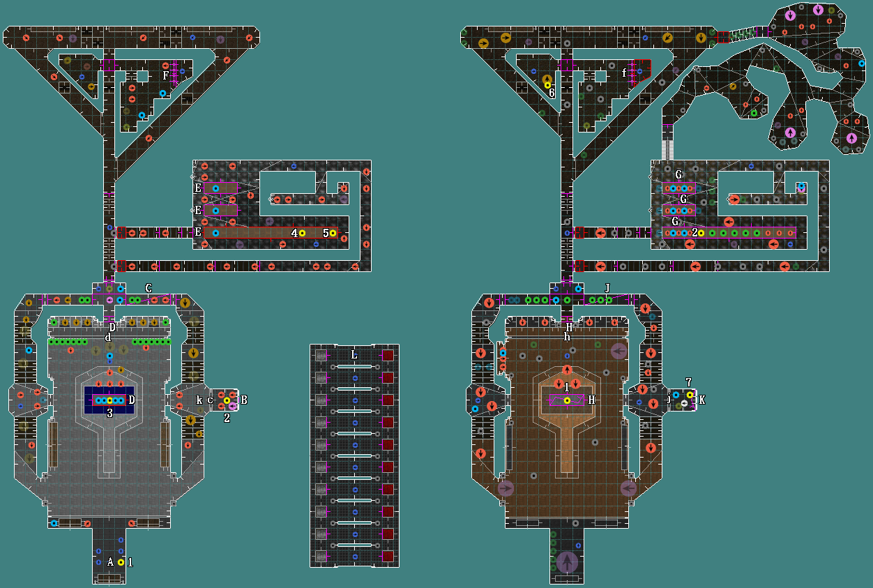 | A.初始位置 B.出口按鈕 C.走過會開啟牆c D.走過會開啟牆d E.觸碰可分別降下平台 F.與傳送點f互傳 G.觸碰會一次降下平台 H.走過會開啟牆h J.走過會開啟牆j K.傳送至k L.多人模式陣亡才會到此 1.霰彈槍 2.綠護甲 3.火箭炮 4.機槍 5.超級球 6.電鋸 7.雙管霰彈槍 |