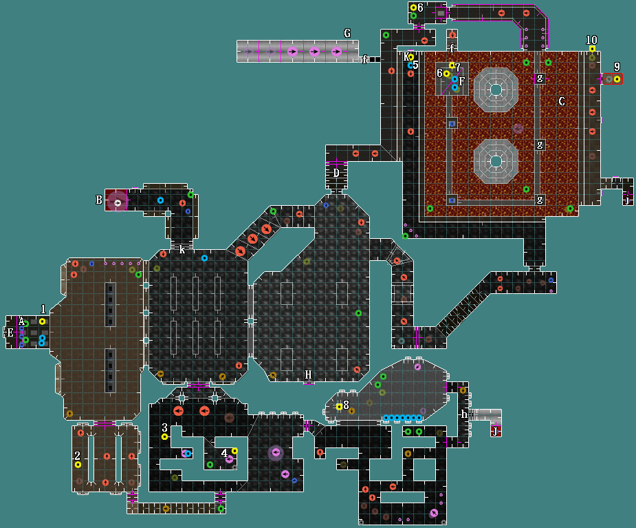 | A.初始位置 B.出口傳送點 C.幅射區域,每秒5傷 D.幅射區域,每秒10傷 E.需藍鑰匙開啟的門 F.走過會開啟傳送點G G.傳送至g H.武器攻擊可開啟牆 J.走過會暫時開啟傳送點K K.傳送至k 1.霰彈槍 2.綠護甲 3.無敵 4.火箭炮 5.電漿槍 6.隱形 7.雙管霰彈槍 8.電鋸 9.幅射防護衣 10.藍鑰匙 |