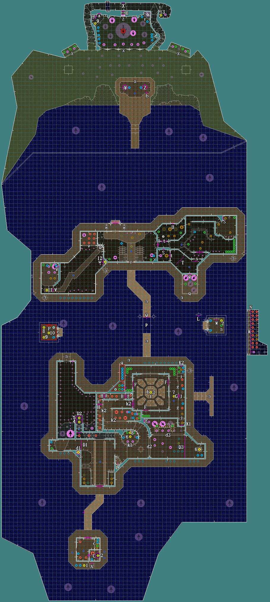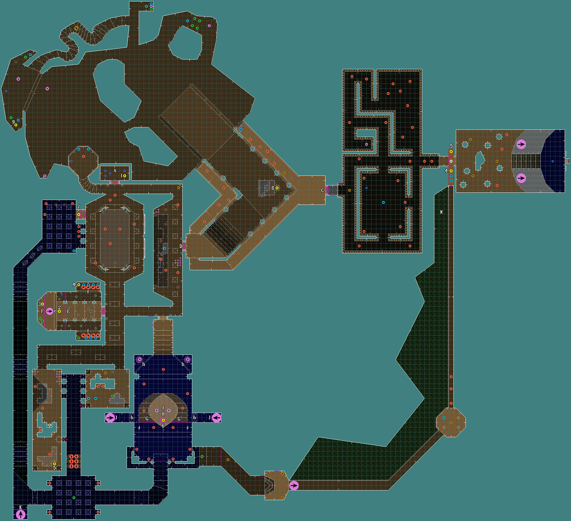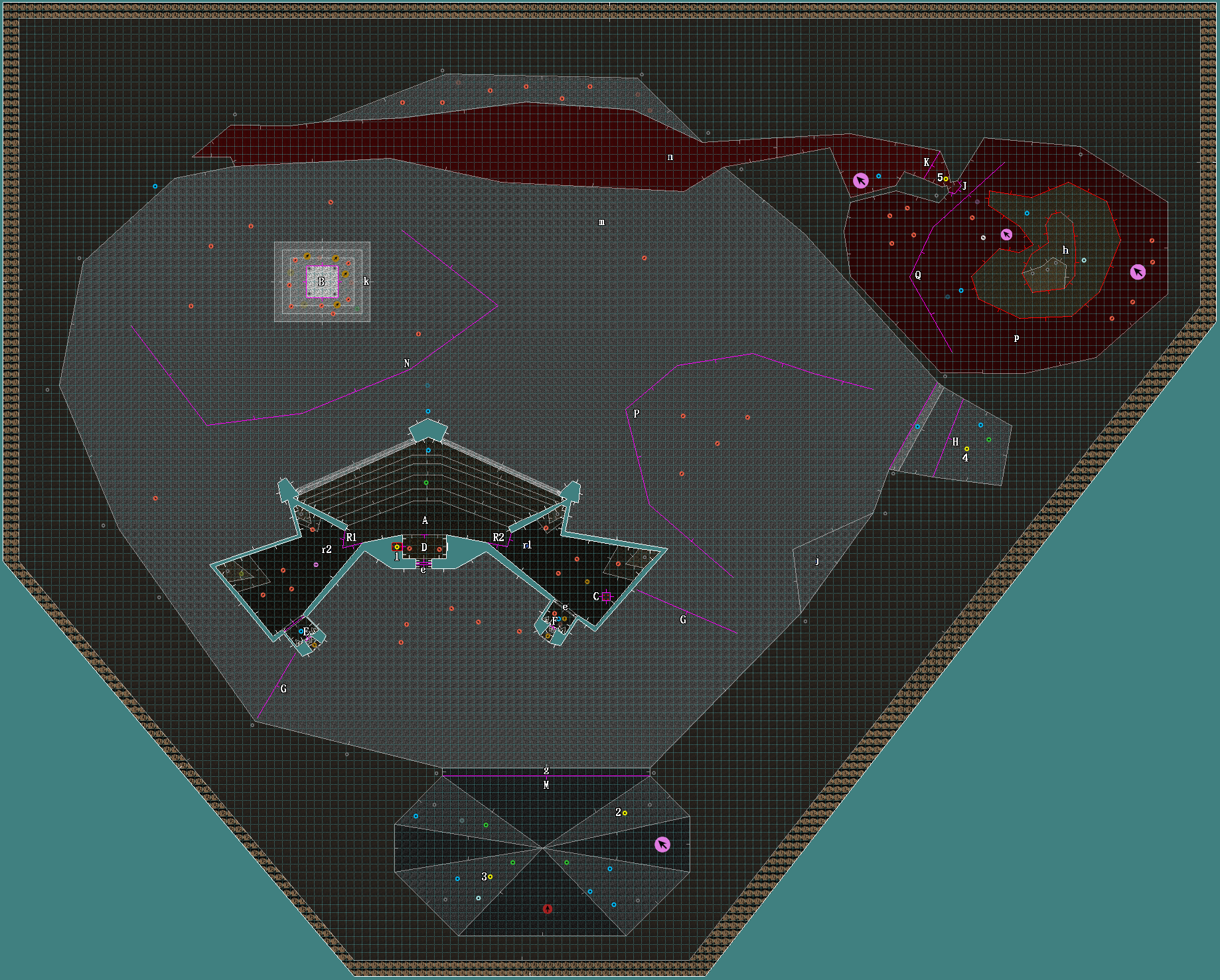 | A.初始位置 B.出口按鈕 C.需紅鑰匙開啟的門 D.需藍鑰匙開啟的門 E.走過會開啟牆e F.走過會開啟牆f G.走過會降下平台g H.走過會開啟牆h J.怪物傳送至j K.幻象牆 M.超級幅射區域,每秒20傷 (掉下必死) 1.霰彈槍 2.藍鑰匙 3.電鋸 4.綠護甲 5.狂暴 6.靈魂球 7.雙管霰彈槍 8.火箭炮 9.紅鑰匙 |