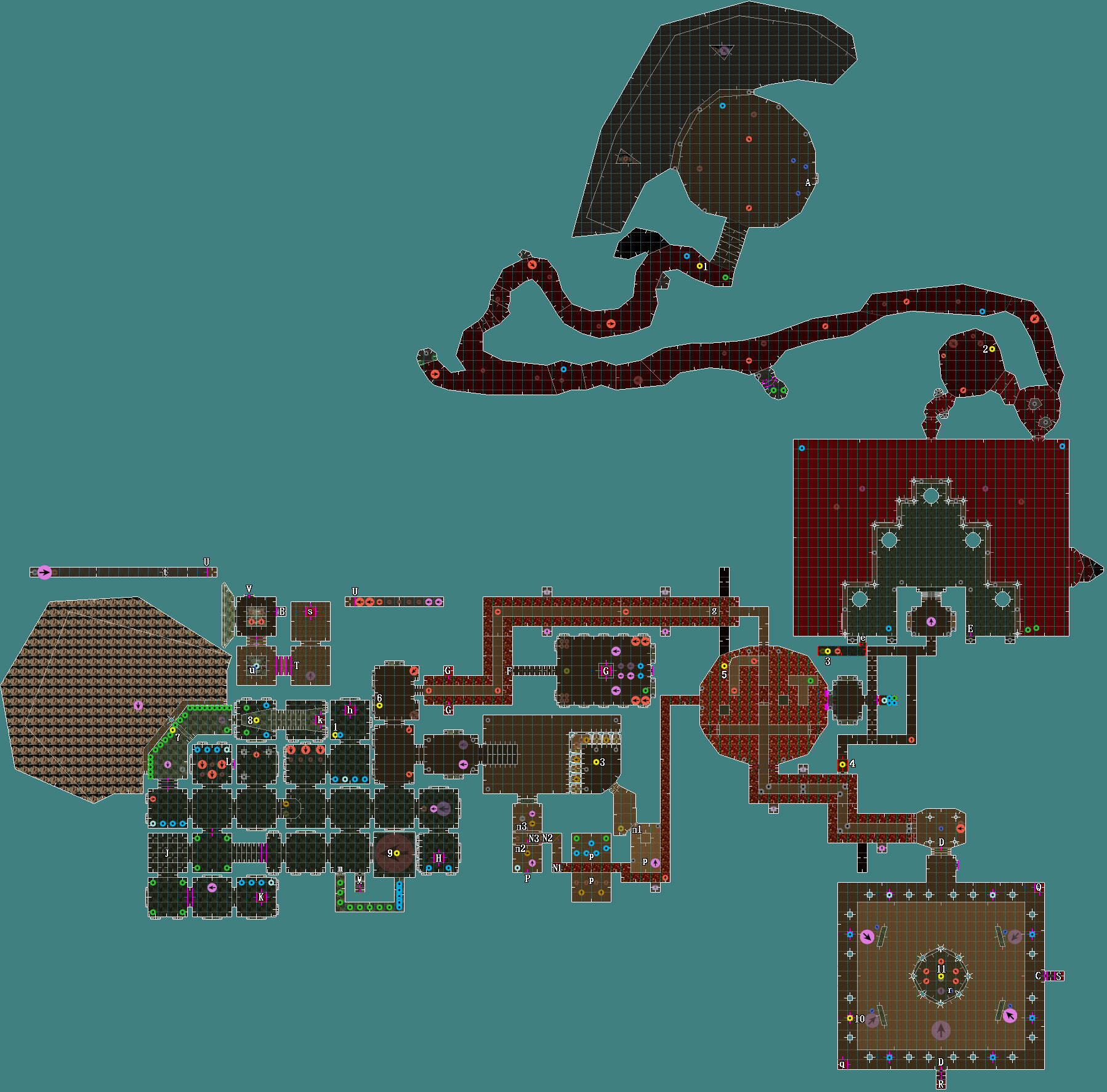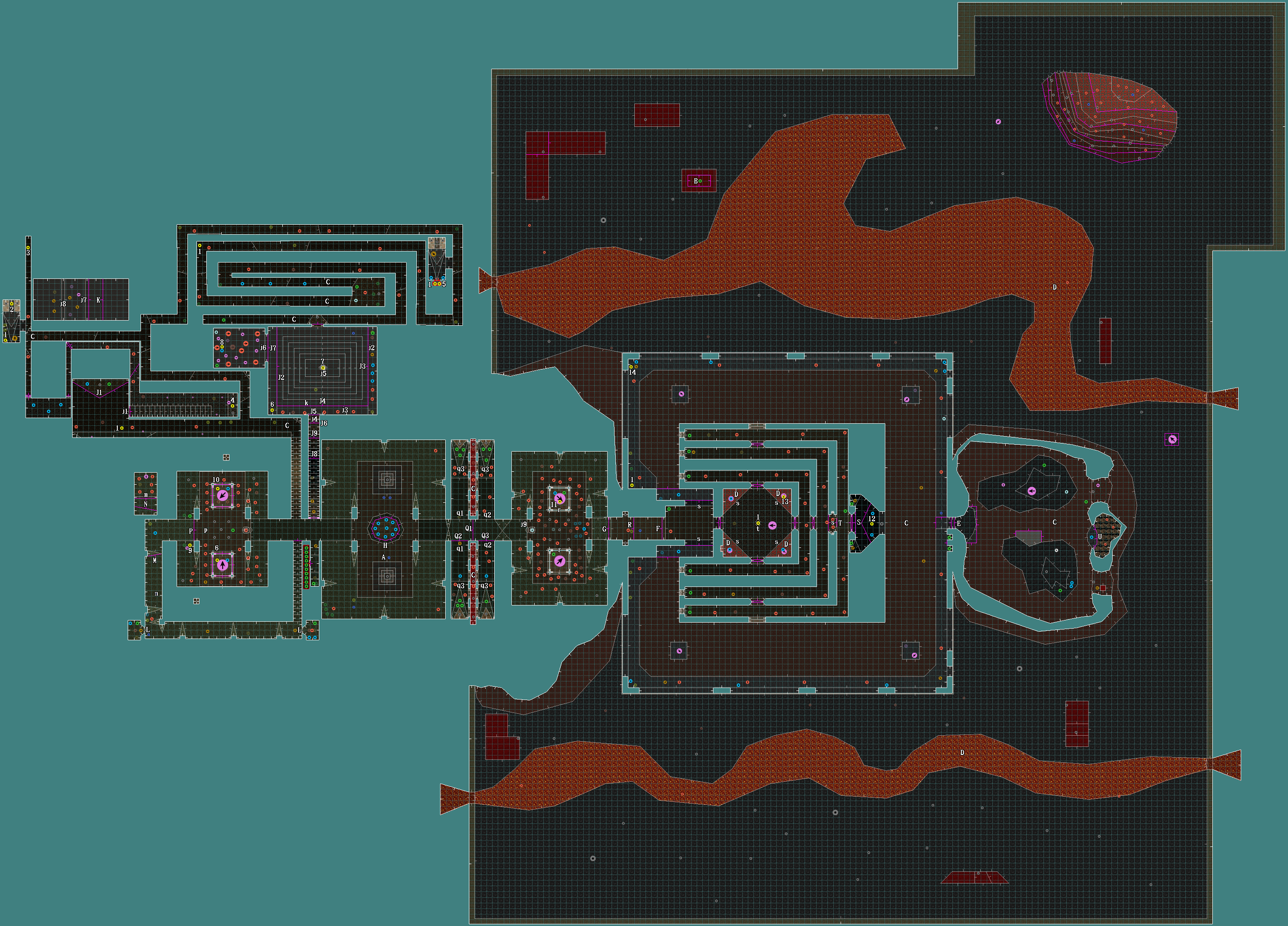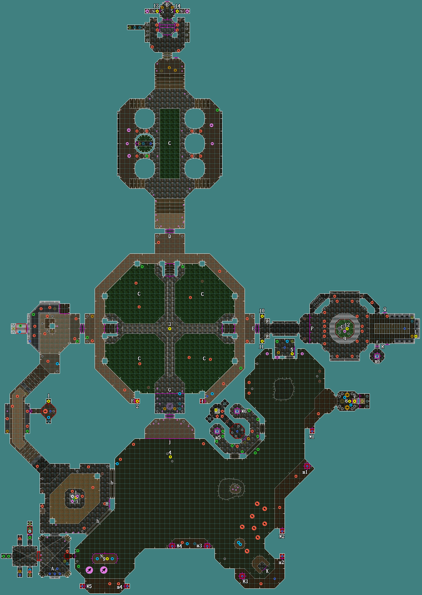 | A.初始位置 B.出口按鈕 C.需紅鑰匙開啟的門 D.需藍鑰匙開啟的門 E.走過會開啟牆e F.走過會開啟牆f G.走過會降下平台g H.走過會開啟牆h J.怪物傳送至j K.幻象牆 M.超級幅射區域,每秒20傷 (掉下必死) 1.霰彈槍 2.藍鑰匙 3.電鋸 4.綠護甲 5.狂暴 6.靈魂球 7.雙管霰彈槍 8.火箭炮 9.紅鑰匙 |