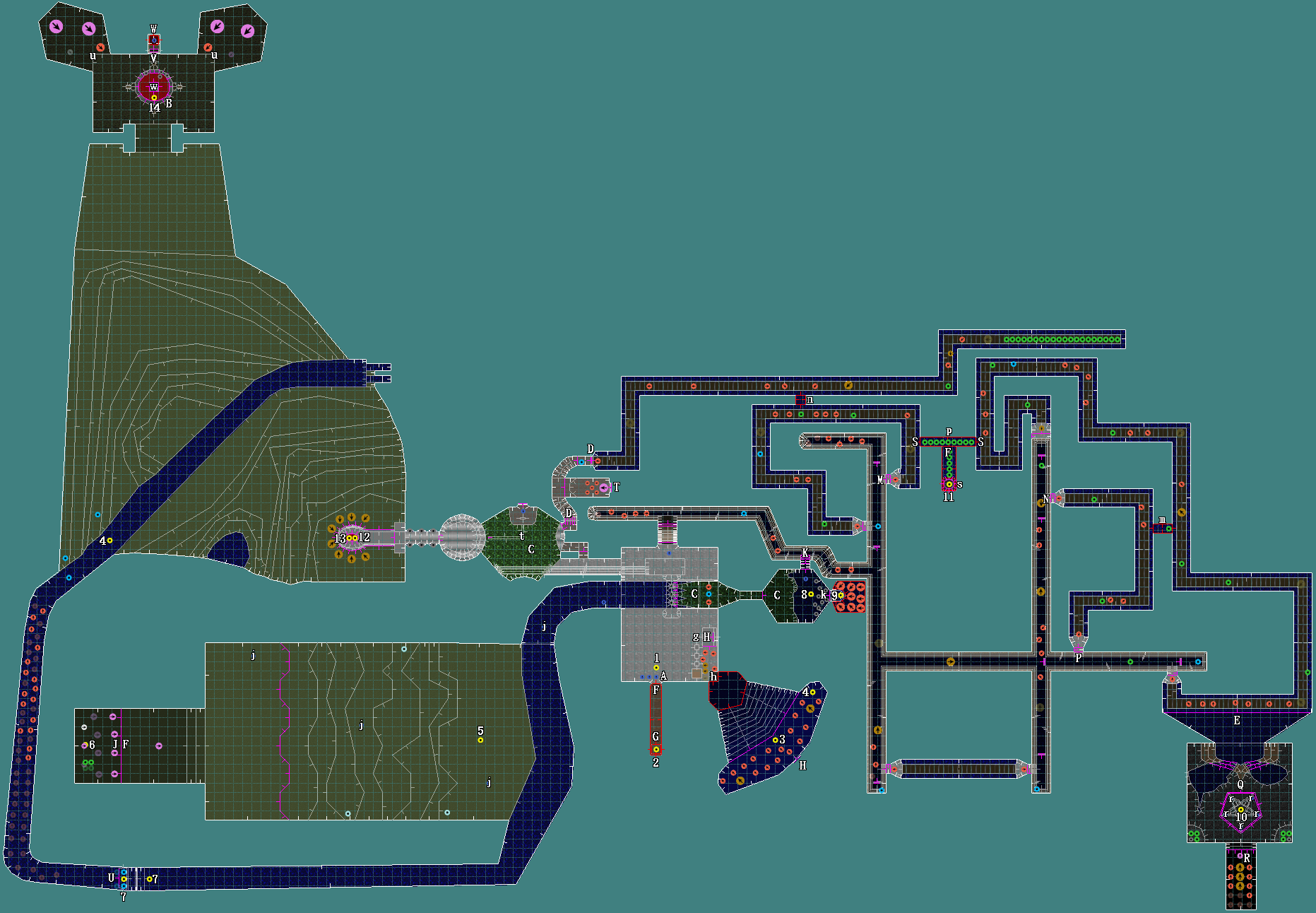 | A.初始位置 B.出口傳送點 C.幅射區域,每秒5傷 D.需黃鑰匙開啟的門 E.需藍鑰匙開啟的門 F.需紅鑰匙開啟的門 G.幻象牆 H.開啟牆h的按鈕 J.走過會開啟牆j K.暫時開啟牆k的按鈕 M.走過會開啟牆m N.走過會升起平台n P.走過會開啟牆p | 1.電槳槍 2.霰彈槍 3.雙管霰彈槍 4.火箭炮 5.藍護甲 6.藍鑰匙 7.綠護甲 8.超級球 9.紅鑰匙 10.黃鑰匙 |
