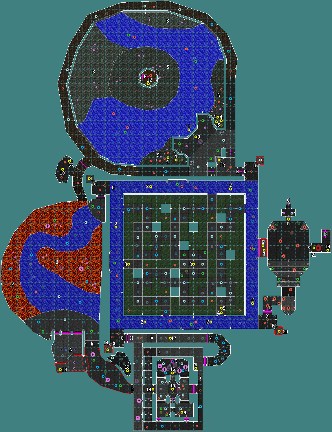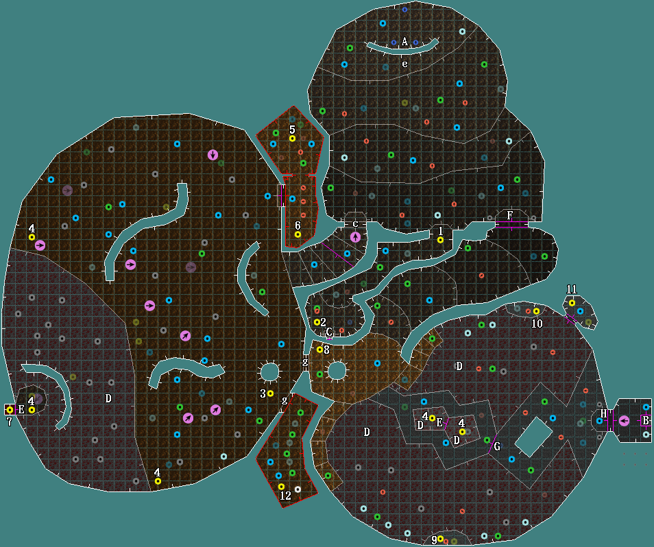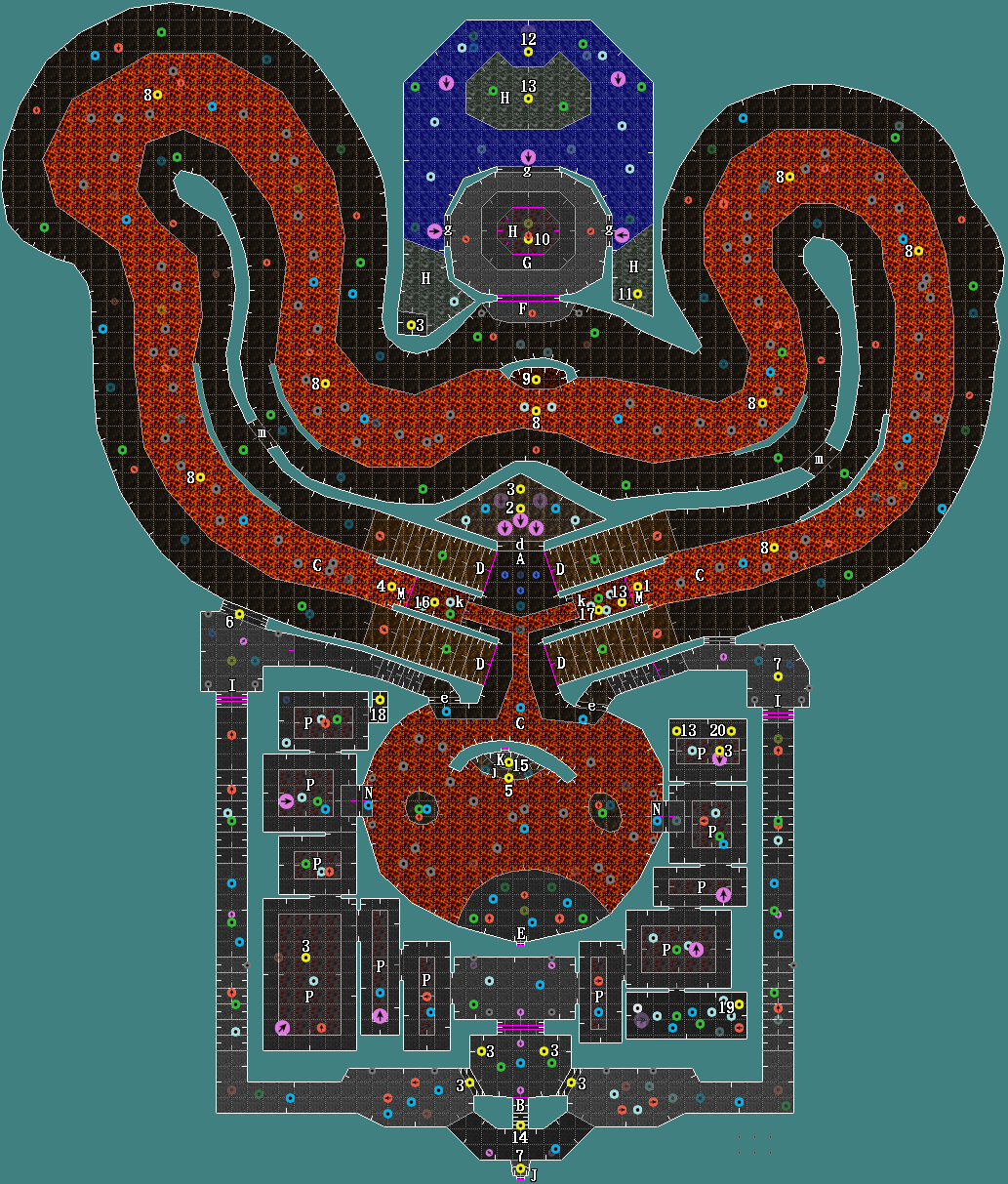 | A.初始位置 B.出口傳送點 C.開啟牆c的按鈕 D.熔岩,每秒16傷 E.傳送至e F.需黃鑰匙開啟的門 G.走過會開啟牆g H.需綠鑰匙開啟的門 1.火把 2.太虛弩 3.飛翔之翼 4.補血藥瓶 5.能量之書 6.盾牌 7.黃鑰匙 8.隱身魔球 9.龍爪 10.綠鑰匙 11.神秘骨灰 12.地獄魔杖 |