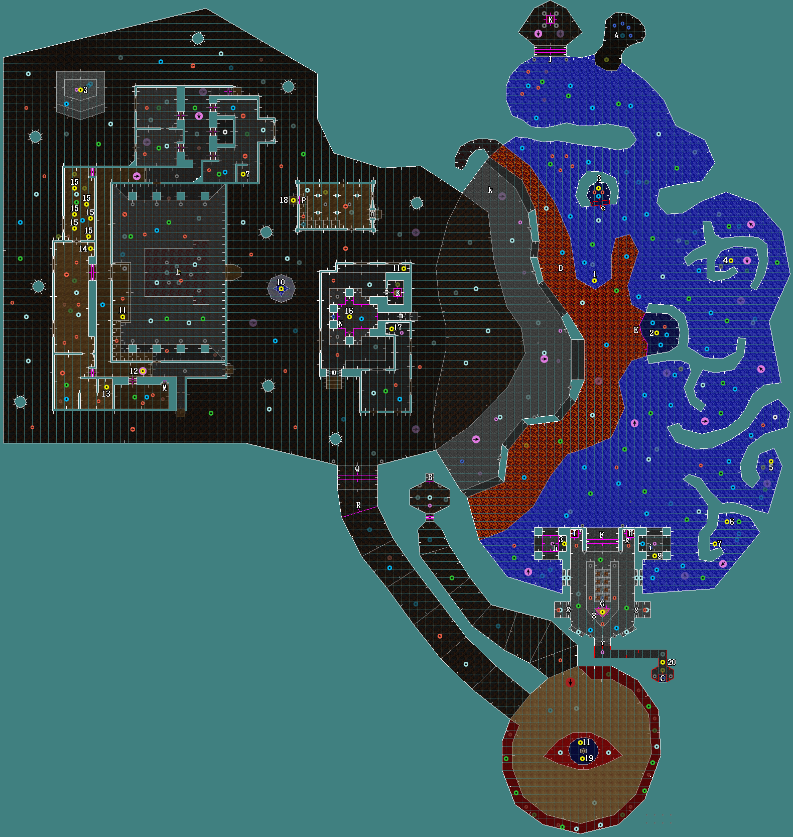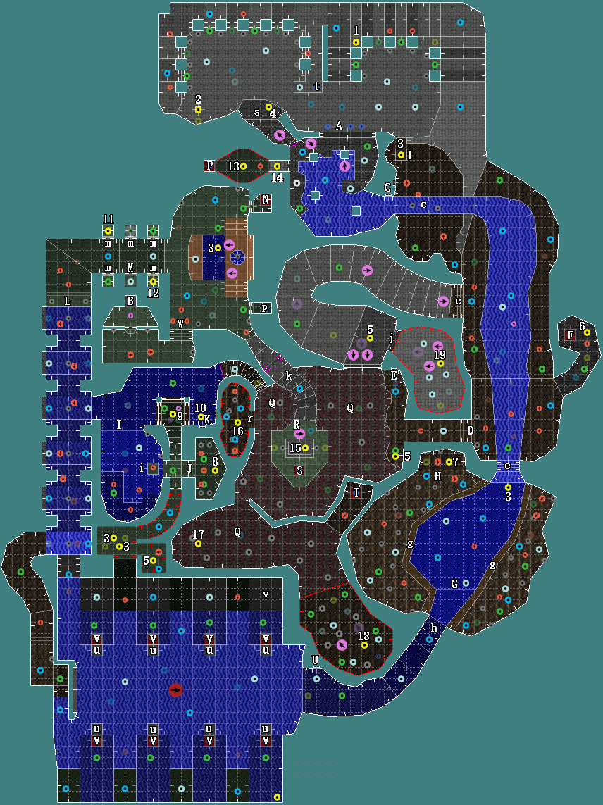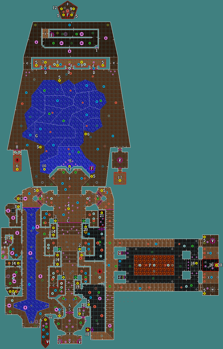 | A.初始位置 B.出口傳送點 C.開啟牆c的按鈕 D.熔岩,每秒16傷 E.傳送至e F.需黃鑰匙開啟的門 G.走過會開啟牆g H.需綠鑰匙開啟的門 1.火把 2.太虛弩 3.飛翔之翼 4.補血藥瓶 5.能量之書 6.盾牌 7.黃鑰匙 8.隱身魔球 9.龍爪 10.綠鑰匙 11.神秘骨灰 12.地獄魔杖 |