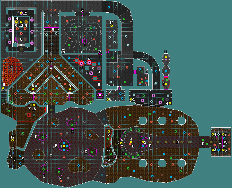 *** 攻略圖示說明(點小圖可看大圖) 1.黃色圓圈:武器、鑰匙、強化裝置、寶物等較重要物品 2.綠色圓圈:補充生命的物品 3.青色圓圈:補充彈藥的物品(淡青色為魔龍爪、地獄魔杖、鳳凰魔杖的彈藥) 4.白色圓圈:背包 5.橙色圓點:一般敵人,不同類型敵人有不同大小圓點(箭頭為面對方向) 6.棕色圓點:鬼魂類敵人(箭頭為面對方向) 7.紫色圓點:蛇騎士門徒以上較強的敵人(箭頭為面對方向) 8.暗紅圓點:魔王級敵人(箭頭為面對方向) 9.紫色線:控制動作的物品,如門、按鈕、控制線等 10.紅色框:秘門或秘密區域 11.紫色小圓圈:會爆炸的瓦斯囊 12.暗藍色圓點:初始或陣亡時我方出現的位置(箭頭為面對方向) 13.灰色圓圈:不重要的障礙物、裝飾品等 主地圖以單人模式普通級為基準,簡易級、困難級或多人模式,請自行從暗化標記猜測。又, 火鎚標示出現在多處者,只會隨機出現在其中一處。 *** 第二章 Hell's Maw 第2-1關 The Crater