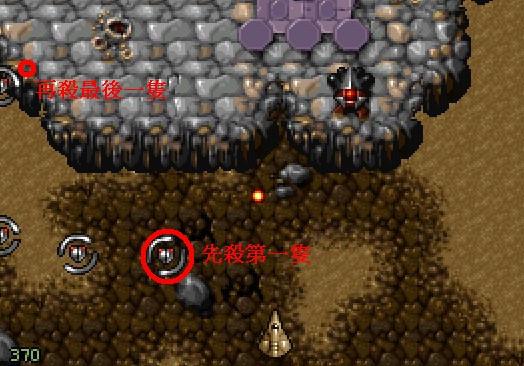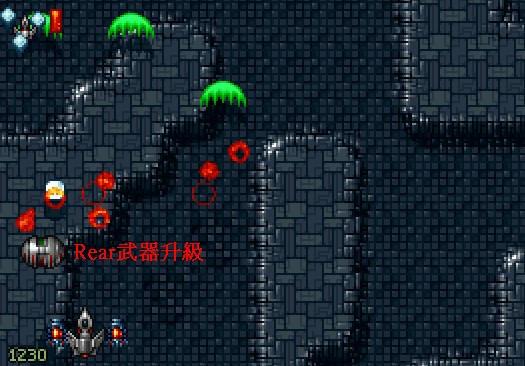 (2)後期出現綠色飛機過炮陣後第二群快速敵機,打掉最右邊第2隻可提升Rear武器等級。