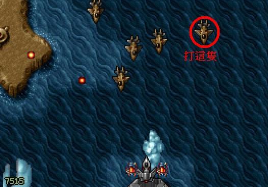 (3)一開始的U型敵機,除第一架外都不殺,則通過spike後,出現一排5架往下的敵機,後