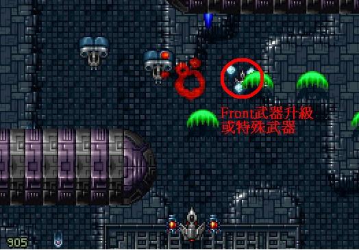 (1)開始不久的第3群(左邊)第一隻敵機可得到特殊武器或提升Front武器等級。