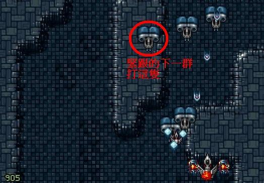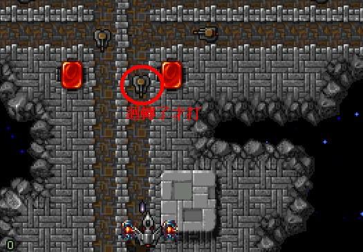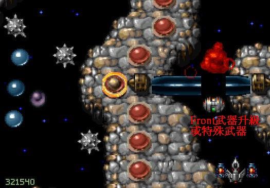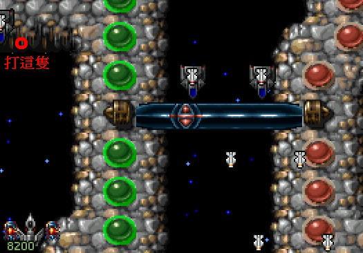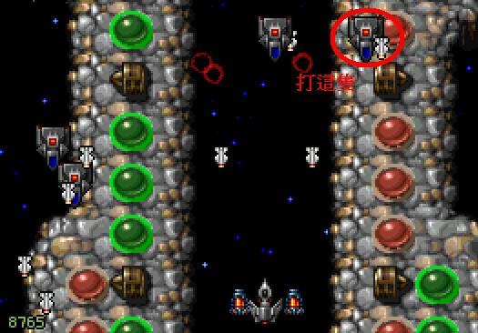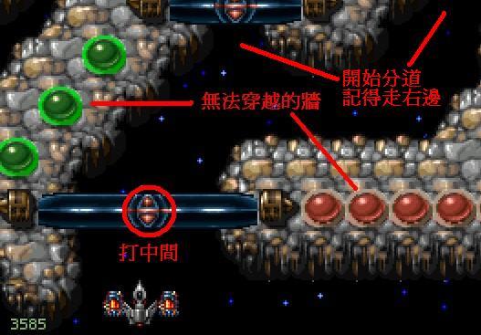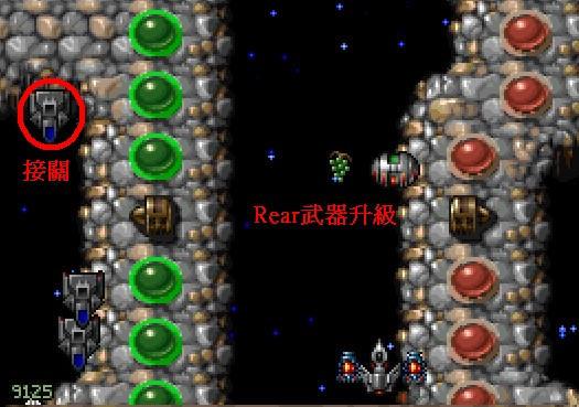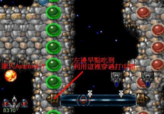 (1)連排草莓後的左邊通道有可進入Asteroid-?隱藏關的敵機,但和中間通道提升Rear武器