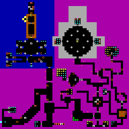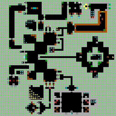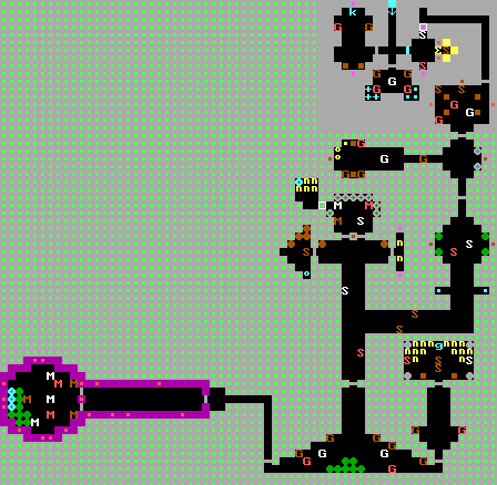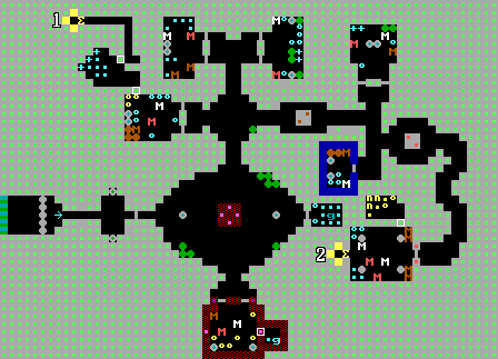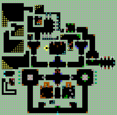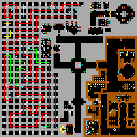 | 先往北拿鑰匙,再往東拿鑰匙 西邊紅線為值得走的路線,綠色為會被阻塞無法到達(無法100%) 西邊有兩個第一章魔王Hans Grosse,要注意 北邊魔王前的兩個暗格為路徑二擇一,推上為加命,推下為魔王 西北環狀線可能會卡死自己,切勿亂推